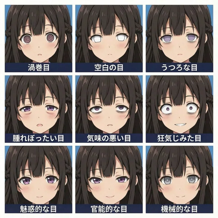 صورة مربعة واحدة مقسّمة إلى شبكة نظيفة 3x3 من التسع مربعات المتساوية. يحتوي كل مربع على شخصية الفتياة من الصورة 1، بورتريت مقرّب، فقط الرأس والعنق، والوجه يملأ معظم الإطار. لكل مربع عيون مختلفة. ضع النص الياباني أدناه كل مربع كوسيلة تسمية، دون لمس الحواف. 1: عيون مُحَوَّرة: عيون مُحَوَّرة فقط 2: عيون فارغة: عيون فارغة 3: عيون فارغة: عيون فارغة 4: عيون مُنتفخة: عيون مُنتفخة 5: عيون مخيفة: عيون مخيفة 6: عيون مجنونة: عيون مجنونة 7: عيون مُغريّة: عيون مُغريّة 8: عيون جذابة: عيون جذابة 9: عيون ميكانيكية: عيون ميكانيكية لون خلفية أزرق بسيط. دقة عالية. تصميم ورقة ملصقات، ترتيب مثالي 3x3.