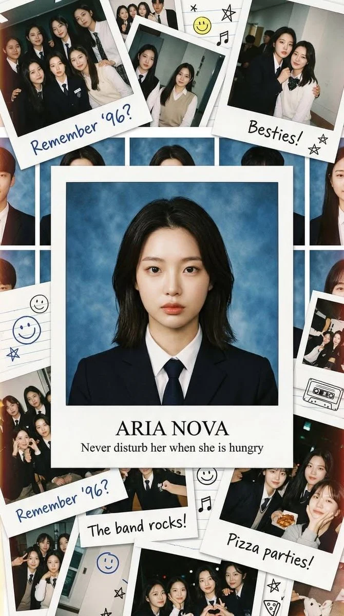 [ コアのプロンプト - テンプレート ] 詳細に描写された1990年代風のハイスクールの学年誌ページコラージュシーン。上方からの視点。高密度で重なり合いたる宝麗来スタイルの写真、手書きのメモ、スケッチが詰まっており、当時の実際の学年誌ページのコラージュレイアウトを模倣しています。中心には [ 主體参照 ] の目立つ宝麗来スタイルの写真があり、これが中央のポートレートのための主要な視覚的参考となります。[ 中央ポートレートの詳細 ] コントラスト:厳格な正面向きで、中央に配置された頭部から肩までのバストショット。特徴:ポートレートは参照画像の顔の正確な特徴と画像1を保持しています。額縁:独特で太い白い宝麗来スタイルの枠によって囲まれています。周囲の要素:隣接するポートレートの枠の一部や、小さな局所的な頭部ショットが僅かに見え、完全なページの肖像を示唆しています。照明と肌:本物の90年代スタジオフラッシュ照明、直接的で柔らかい影を持ちます。肌のテクスチャは完璧で自然であり、極めて少ないジェンダーニュートラルなフォトレディメイクを持っています。服装:ダークな学校のブレザーに、きっちりとした白い襟付きシャツ、そして合致するダークカラーのネクタイまたはリボンの蝶ネクタイ。背景:フレーム内のクラシックなテクスチャの斑点のある青いスタジオマッスリン背景。[ グローバル属性とレイアウト ] 品質:高品質なアナログフィルムスキャンの特徴:見られる微細な粒、抑えられたノスタルジックなトーン、そして端にあるわずかなライトリーク。コラージュの内容:中央の宝麗来写真の周囲には、他の重なり合う写真、青と黒のインクで書かれた手書きメモ、およびスケッチ(笑顔、星)が、高密度かつ組織的なコラージュ形式で分布しています。[ テキストブロック - 階層 ] ポートレート以下の白い枠領域内では、2行分の中央揃えセリフ体タイポグラフィが配置されています:1行目:より大きな太字で中央揃えの「Name(名前)」。2行目:より小さく、通常重みの中央揃えの「DESCRIPTION(説明)。」