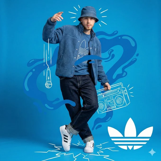 无明显渐变" "additional_elements": [“矢量液体形状(obj_012)用作辅助背景层” ] }, "前景元素": {“粒子”: “无”, “人工制品”: “白色矢量涂鸦(麦克风、音响、裂纹)用作前景叠加层” }, "重建说明": {"mandatory_elements_for_recreation": [“身穿全套蓝色阿迪达斯服装的男模特” “夹克上的羊毛质感” “牛仔裤和帽子上的白色对比缝线” “手绘白色涂鸦叠加层(麦克风、音响、三叶草)” “脚下地板开裂的效果” “以白色点缀的单色调蓝色调色板” “动感十足的‘酷炫’姿势” ], "sensitivity_factors": "真实照片与扁平矢量图形之间的融合必须清晰锐利。服装的蓝色调必须与背景的蓝色协调一致,
