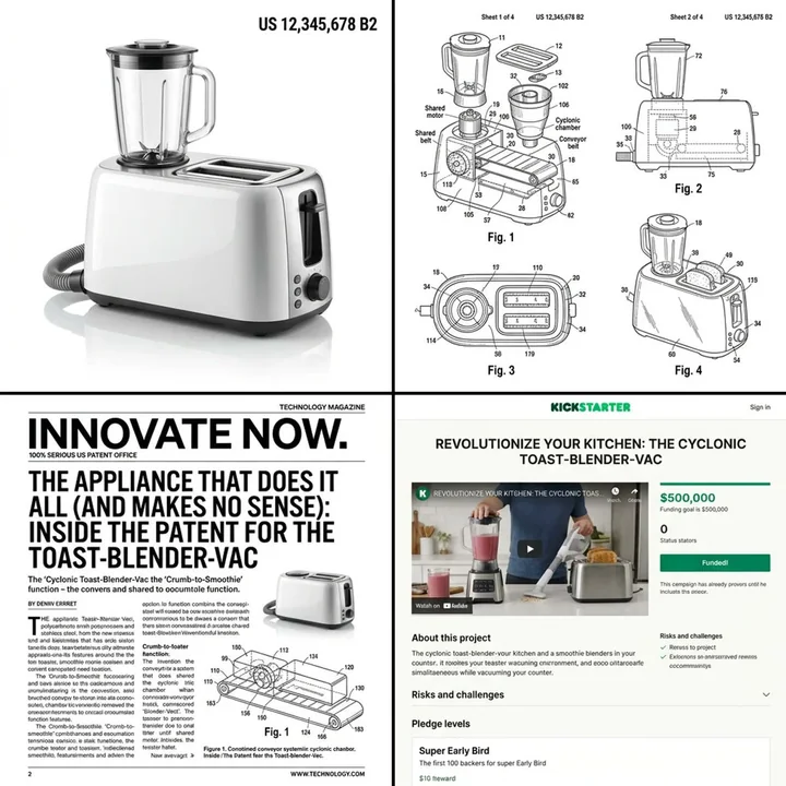 Combine these three objects into one single absurd but legally patentable invention. Output: Official patent title (overly long) USPTO-style abstract (150 words) 4 ridiculous 'claims' One real-sounding problem it solves Style: 100% serious US patent office document. Create four clean black-and-white technical patent drawings (exploded view, side, top, perspective) of this new invention in classic patent illustration style. Now render the final product in glossy Apple-product-photography style on white infinity background with subtle reflection. Add fake patent number in corner.
