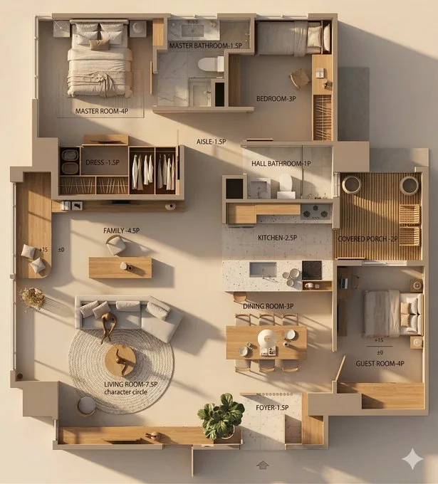 تصميم داخلي من نوع جاباندي، تخطيط منشأة سكنية من منظور طائر ينظر من الأعلى، مخطط أرضي معماري تفصيلي للغاية، جميع الأثاث مكتمل ومطابق لأسلوب جاباندي مع خشب دافئ وقصب بامبو وألوان أرضية هادئة، مناطق وظيفية مميزة، إضاءة من طول ذروة ذهبية مشرقة، ظلال ناعمة وواقعية، نسيج مواد واقعية (خشب، ماربلا، أقمشة)، معماري 3D