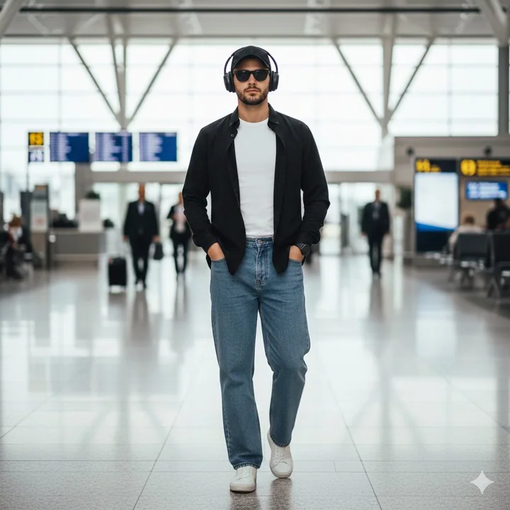 スタイリッシュな若い男性が、自然に空港ターミナルを歩き、旅行必需品を気軽に持ち歩いている。パスポートは見えず、彼が旅行中であることを示している。彼はオーバーイヤーヘッドホンをかけ、リラックスした自信に満ちた歩き方をしている。彼は整えられた薄めのひげを生やし、現代的なキャップの下から数本の髪が見える。また、クールな旅行スタイルを演出するため、スタイリッシュなブラックのサングラスをかけている。服装は、ズボンの上から出ている白いインナーティシャツに、前を開けて着ている黒いシャツ。彼はゆったりとしたストレートフィットのジーンズと、清潔なホワイトのスニーカーを着ている。シーンの詳細:現代的な空港の内装、ソフトなシネマティックな照明、浅いディープフォーカス、背景の旅人達のモーションブラー、超リアルなテクスチャ、トラベルライフスタイルの美学、ハイファッションストリートスタイル、4Kのリアル感。