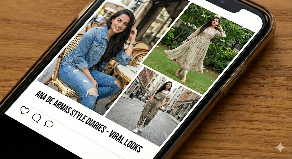 { "subject": "Ana de Armas", "gallery_content": [ { "image_id": "1000583385.jpg", "context": "Daily Life / Routine", "description": "A bright, natural shot of the actress in a home setting.", "details": { "location": "Residential bathroom with wooden accents", "action": "Brushing teeth with a manual toothbrush and Colgate toothpaste", "attire": "Classic white t-shirt paired with blue denim jeans", "atmosphere": "Casual, morning-fresh, and natural" } }, { "image_id": "1000583383.jpg", "context": "Professional / Healthcare Role", "description": "A scene depicting a compassionate medical professional.", "details": { "location": "Hospital room with medical equipment and a window view", "role": "Female doctor/physician", "action": "Holding the hand of an elderly patient in a supportive manner", "attire": "Professional white lab coat, blue surgical scrubs, and a stethoscope", "atmosphere": "Empathetic, calm, and professional" } }, { "image_id": "1000583276.jpg", "context": "Digital Media / Fashion", "description": "A smartphone display showcasing a style-focused social media post.", "details": { "platform": "Social media interface titled 'Ana de Armas Style Diaries - Viral Looks'", "content_type": "Fashion collage featuring multiple outfits", "outfits_shown": ["Denim jacket with jeans", "Floral ethnic dress", "Olive green overalls"], "atmosphere": "Trend-setting and influential" } } ], "overall_summary": "A collection illustrating the subject's range from relatable daily life to professional personas and fashion influence." }