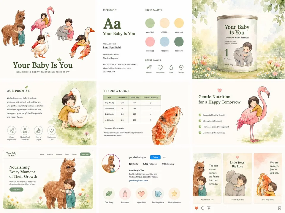 Используя изображение, которое я предоставил вам, пожалуйста, создайте для бренда молочной смеси, названного «Your Baby Is You», комплект из 3x3 изображений (без рамок), каждое изображение должно иметь соотношение сторон 4:3, пожалуйста, убедитесь, что включены основные элементы бренда, такие как логотип бренда, шрифты и сопровождающие схемы, одновременно также предоставьте некоторые примеры шаблонов для веб-сайтов и социальных сетей.