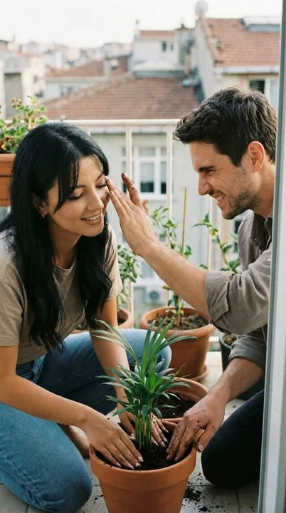 { "generation_request": { "meta_data": { "tool": "NanoBanana Pro", "task_type": "photoreal_candid_domestic_growth", "version": "v10.0_FIRST_PLANT_TOGETHER_EN", "priority": "highest" }, "output_settings": { "aspect_ratio": "9:16", "orientation": "portrait", "resolution_target": "ultra_high_res", "render_style": "ultra_photoreal_candid_film_still", "sharpness": "natural", "film_grain": "subtle_35mm", "color_grade": "warm_afternoon_balcony", "dynamic_range": "natural_not_hdr", "skin_rendering": "real_texture_no_retouch" }, "global_rules": { "camera_language": "35mm candid realism", "lighting_language": "soft afternoon daylight only", "authenticity_markers": "real soil texture, dirty fingertips, natural plant detail" }, "creative_prompt": { "scene_summary": "Small balcony. They kneel together planting a small green houseplant in a pot.", "subjects": { "count": 2, "description": "same couple, relaxed and playful", "expression": "gentle smiles, soft teasing" }, "wardrobe": { "female": "casual t-shirt and jeans", "male": "rolled sleeves shirt" }, "micro_action": "she presses soil gently around the roots; he brushes a little dirt off her cheek playfully", "environment_details": { "location": "Istanbul apartment balcony", "background": "city rooftops softly blurred, other small plants nearby" }, "composition": "vertical medium close; hands and soil visible; imperfect candid crop", "mood": "growth, shared future" }, "negative_prompt": [ "studio lighting", "AI glow", "perfect staged garden", "HDR", "beauty retouch", "text", "logos" ] } }