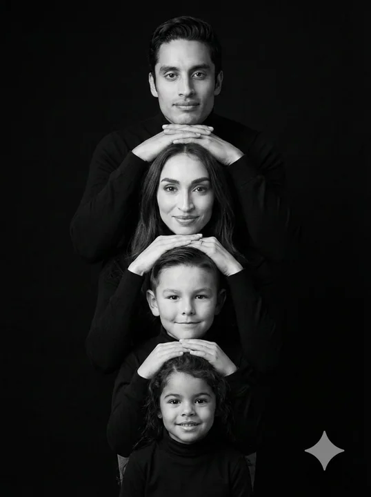 Строго сохранить внешность всех четырёх лиц 1:1 — лица, черты, пропорции, возраст, текстуру кожи, длину и цвет волос, без ретуши или сглаживания; фотография — единственный источник. Черно-белый портрет в студии, соотношение сторон 3:4, вертикальная симметричная композиция. В кадре четыре человека, строго выстроенные по центру в одной вертикальной линии. Внизу — самый молодой ребёнок, по центру, смотрит прямо в камеру, лёгкая естественная улыбка. Над ребёнком — старший ребёнок, находящийся прямо за ним, обеими руками ласково лежит на голове младшего ребёнка, пальцы переплетены, лёгкая жизнерадостная улыбка. Над ним — женщина, обеими руками ласково лежит на голове старшего ребёнка, пальцы переплетены, лёгкая жизнерадостная улыбка. Вверху — мужчина, стоящий за женщиной, обеими ладонями сложенными вместе и лёгко лежащими на её голове, пальцы переплетены, смотрит прямо в камеру, спокойное и уверенно выражение лица. Все носят одинаковые чёрные высокие воротники без украшений. Фон — полностью чёрный, без текстуры. Свет мягкий, направлен с передней стороны и слегка с верху, скульптурный, умеренный контраст, чёткие детали кожи, без эффекта блеска, без изменения поз или расстояний. Гиперреализм, 8К.