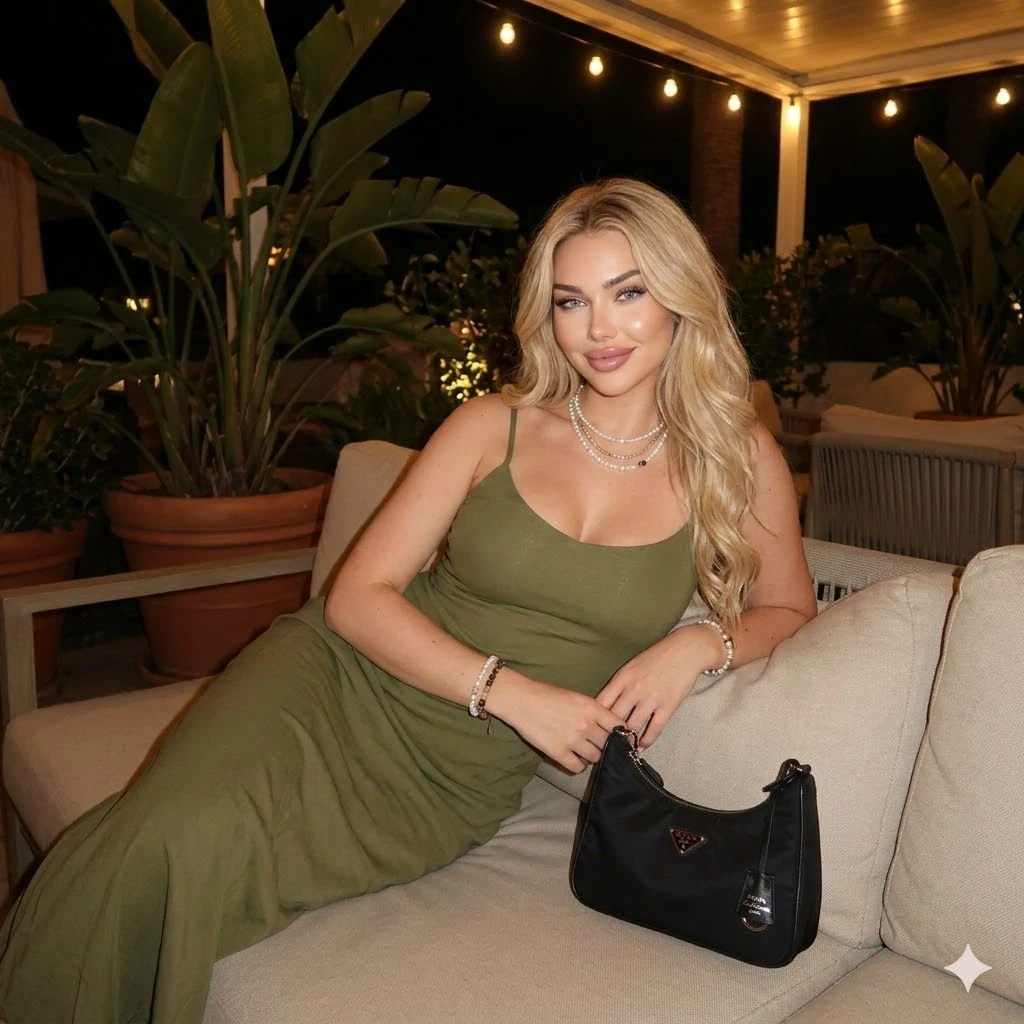 "prompt": "金发女郎晚上在米色户外沙发上休憩。身穿橄榄绿吊带裙,戴着珍珠项链和手镯。她身边放着一个黑色的普拉达包。背景中有盆栽植物。",