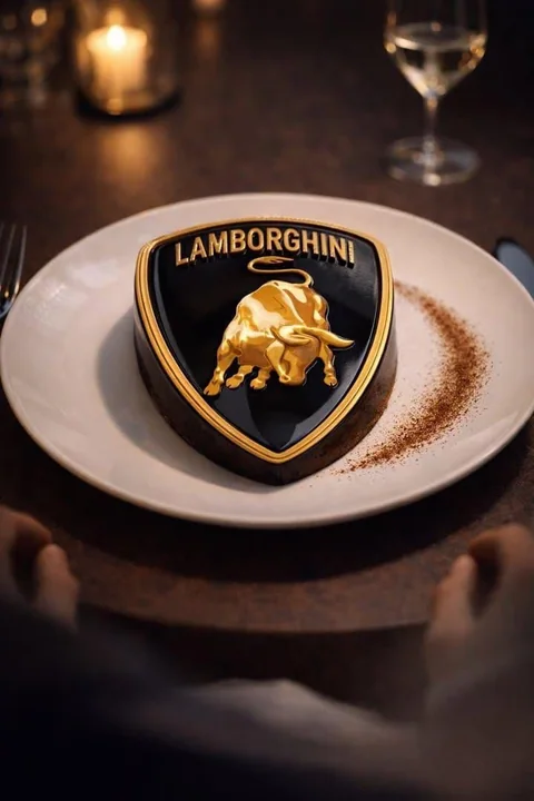 超現実的な高級レストランのデザート写真。BMWのロゴにデザインされた豪華なプレートドムースケーキで、光沢のある青と白の四象限に分割され、チョコレートのベースを備え、白いセラミックプレートの上に置かれている。プレートには繊細なココアパウダーガーニッシュと弧状のスパッティングが施されており、温かく照らされたキャンドルのレストランの雰囲気、浅いボケ、映画的なボケ効果、柔らかなゴールデンハイライト、高級編集用のフードスタイリング、85mmレンズの見た目、高コントラスト、豊かな質感、エレガントで上質なムード、超詳細、4K品質。