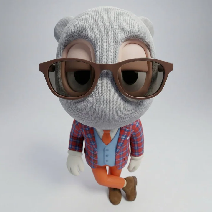 一张具有强烈视觉冲击力的鱼眼产品照片,以扭曲的强制透视效果展示了角色的全身。头部在前景中显得巨大,四肢逐渐模糊,卡通化却又基于真实的细节。姿势:角色略微前倾,仿佛踏入观看者的空间。超大的头部最靠近镜头,眼睛锐利而引人注目,而手臂则松散地垂在身体两侧。鞋子逐渐模糊,消失在背景中。相机:鱼眼微距,15–20mm 镜头,略微向上倾斜以夸大前倾姿势。灯光:强烈的正面光线展现出精细的表面纹理,躯干处有柔和的补光阴影,并有微弱的轮廓光晕将人物与背景分离。眼睛:眼睛通过立体照明、表面细微渐变、清晰的镜面高光以及周围的对比阴影得到强调,以增加深度和表现力,同时不改变其形状。背景:中性无限渐变,柔和的灰白色,没有可见的地面或地平线。材质焦点:极度强调表面品质,无论是哑光、柔软还是粉状,纹理、饰面和细微反射都以高保真度捕捉。手套看起来简单柔软,鞋子在模糊中带有微弱的光泽。情感:直接而亲密,人物仿佛从照片中向你倾斜,要求你的关注。负面提示:无道具,无杂乱,无平坦中性站立姿势。