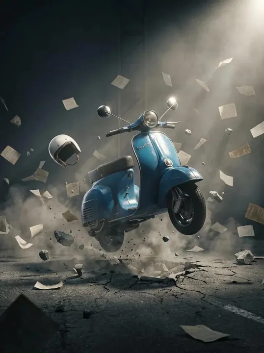 Une scène cinématique hyper-réaliste d'une ancienne scooter bleue style Vespa suspendue en l'air après un impact explosif au sol. Le scooter flotte au-dessus d'asphalte fissuré, entouré de nuages de poussière, de pierres volant, de fragments de béton brisés et de papiers épars figés en ralenti. Un casque blanc rétro tourne à côté, soulignant le mouvement. Environnement de studio cinématique sombre empli de fumée et de rayons lumineux volumétriques. Éclairage directionnel fort venant en haut à droite produisant des reflets glossy sur les panneaux métalliques courbés. Texture de peinture ultra-détaillée, miroirs chromés réfléchissant subtilement la lumière, surfaces de pneus en caoutchouc réalistes. Moment figé capturé comme une photographie ultra haute vitesse, effet de gravité suspendu dramatique, réalisme cinématique, profondeur de champ peu profonde, débris flottants nettement visibles. Pris avec une caméra full-frame, objectif 85 mm, f/2.8, mise au point ultra nette, forte contraste, rendu photoréalistique, ambiance cinématique épique, arrière-plan en dégradé sombre, effet d'explosion de studio, détails en 8K.