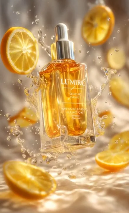 Hyper-realistic luxury skincare product photography of a premium golden Vitamin C facial oil serum in an elegant faceted glass dropper bottle, labeled "LUMIRÓ ÉLIXIR VITAMIN C" with sleek metallic silver cap and pipette, glowing warm amber-orange liquid inside, dramatically centered. A beautiful Western woman with radiant, glowing skin, long flowing hair, wearing a soft white silk robe, elegantly interacting with the product (holding the dropper or admiring the serum) positioned naturally beside the bottle. Surrounded by fresh juicy lemon slices exploding in dynamic motion, vibrant yellow citrus splashing vigorously with flying juice droplets, water splashes and ripples in high-speed freeze-frame effect. Bright radiant golden lighting, cinematic volumetric god rays, sparkling highlights and bokeh, ultra-detailed glass reflections, refreshing and luxurious beauty advertisement aesthetic, professional studio shot, macro lens details, 8k resolution, photorealistic, vibrant citrus tones, high contrast, dramatic liquid dynamics --ar 3:4 --stylize 250 --v 6 --q 2