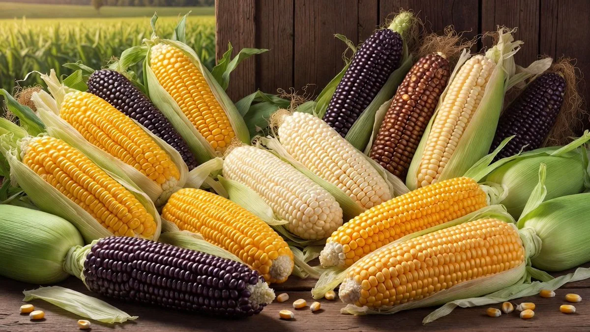 「色彩鮮やかな高解像度の壁紙を生成してください。異なる色調とレイアウトのコーンコブを特徴とし、詳細なコーンカーネルと自然なテクスチャに焦点を当て、質素な農場または屋外の背景を設定してください。」 "style": "フードフォトグラフィー", "resolution": "4K", "colors": ["ゴールデンイエロー", "クリームホワイト", "ディープパープル", "フレッシュグリーン", "アースブラウン"], "elements": ["コーンコブ", "ホルス", "コーンカーネル", "コーンの葉", "農場の畑"]