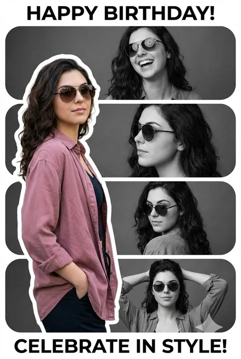 كولاج للصورة الاحتفالية الرأسية. الخلفية تحتوي على أربعة مستطيلات مستديرة أفقية مكدسة، كل منها يحتوي على صورة مونوكروم سينمائية لفتاة صغيرة ترتدي نظارات شمسية وشعر مُلفّع، وتتخذ وضعيات مختلفة. مُفروض على الجزء الأمامي الأيسر هو قطعة مُحذوفة بدقة عالية وبنوعية ألوان كاملة للفتاة نفسها، ترتدي قميصاً وردياً منقوشاً بدرجات اللون الوردي مع نظارات شمسية، وتتخذ وضعية أنيقة، مع حدود بارزة بيضاء من نوع ملصقات.