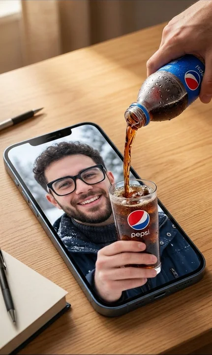 { "SceneType": "Hyper-réalistique, composition commerciale surréaliste", "Perspective": "Placé sur une table en bois", "MainElement": { "Object": "Un smartphone très grand, de très grande taille", "Placement": "Dominant le cadre", "Effect": "Crée une forte illusion de rupture dimensionnelle" }, "InsideTheScreen": { "Subject": { "Reference": "Homme de l'image_0.png", "Appearance": "Apparaît beaucoup plus grand que normal", "Environment": "Environnement hivernal en gros plan", "Pose": "Souriant joyeusement, tenant un verre transparent avec un logo Pepsi clairement visible" } }, "OutsideTheScreen": { "InteractingHand": "Une main humaine réelle", "Action": "Verse du Pepsi cola sombre d'une bouteille froide recouverte de condensation directement vers l'écran du téléphone", "SurrealEffect": "Le liquide semble visuellement percer l'écran et s'écoule dans le verre que l'homme tient à l'intérieur de l'écran" }, "SupportingObjects": [ { "Object": "Un livre fermé", "Placement": "Sur la table en bois à côté du téléphone" }, { "Object": "Un stylo noir", "Placement": "Sur la table en bois à côté du téléphone" } ], "StyleAndAtmosphere": { "Lighting": "Éclairage naturel chaud, ombres cinématographiques douces", "Details": [ "Détails ultra-précis des éclaboussures de liquide", "Texture de peau hyper-réalistique", "Réflexions réalistes sur le verre et l'écran du téléphone" ], "Aesthetic": [ "Esthétique publicitaire cinématographique surréaliste", "Qualité professionnelle de photographie commerciale", "Réalisme 8K" ] } }
