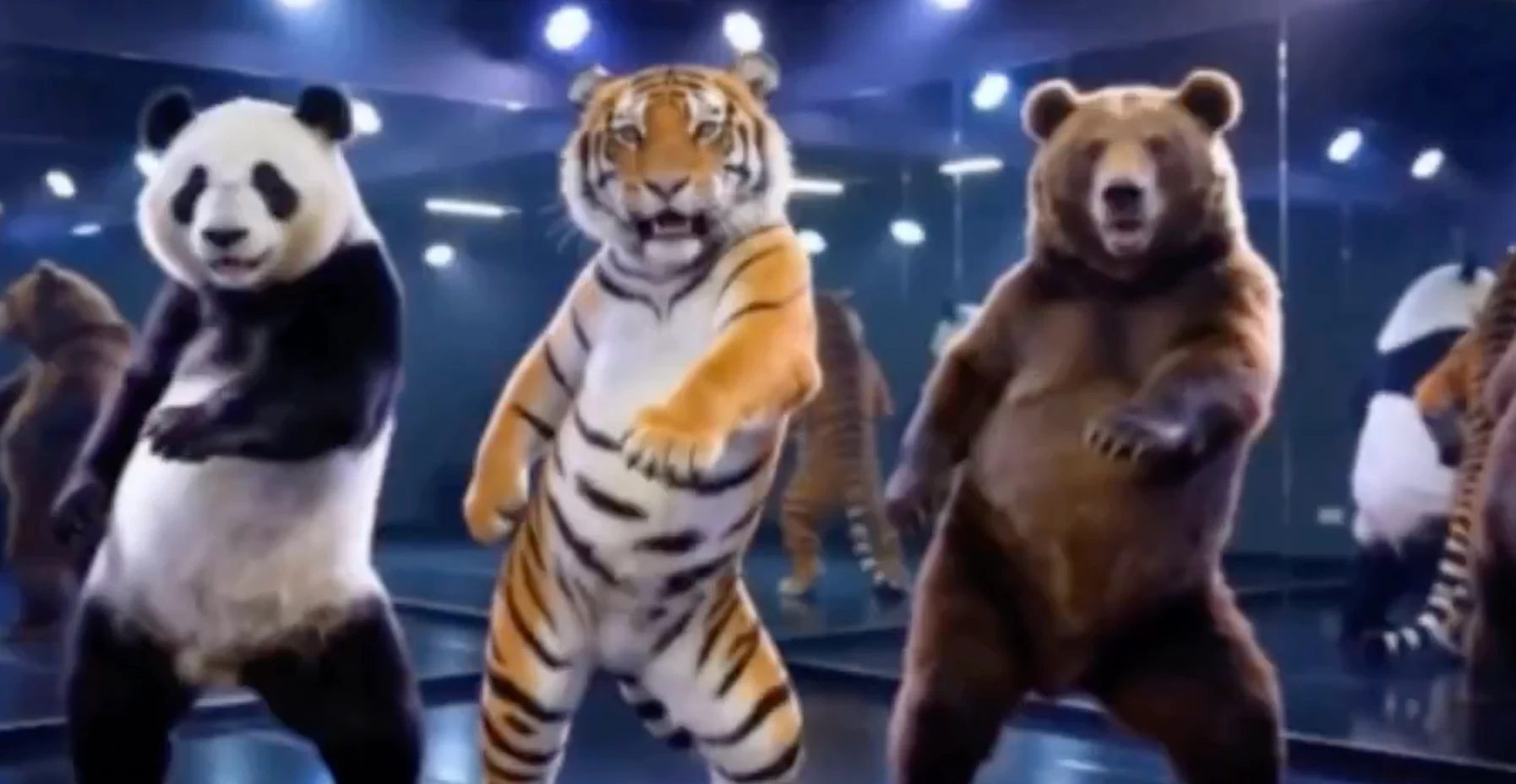 Pandas, tigers, and bears imitating a Korean girl group dance, multiple characters dancing, medium shot clearly showing figures, dance practice room, mirrored walls, floor reflections, atmospheric lighting, pure and sultry style, explosive rhythmic beats, movements neat and powerful, youthful vitality, slightly sexy but not vulgar, high definition quality, cinematic lighting and shadow, TikTok viral texture, smooth dance movements, natural dynamics. Absolutely avoid blur, shaking, distorted movements, character deformation, facial collapse, exposure, vulgarity, extra clutter, messy lighting, stuttering, single person. Parameter settings: Duration: 15 seconds; Motion amplitude: Medium to high (explosive on the beat); Quality: 1080P; Style: General / Dance. Must have strong rhythmic syncopation, soft ambient lighting, cool tone light and shadow. The ending must have a loop transition, suitable for repeated viewing on TikTok. Generate a 15-second video. 根据熊猫和老虎和熊模仿韩舞女团,多人跳舞,中景镜头看清身材,练舞房,镜面墙,地板反光,氛围感灯光,纯欲风,卡点炸,动作整齐有力,青春活力,微性感不低俗,高清画质,电影感光影,抖音爆款质感,流畅舞蹈动作,动态自然 绝对避免模糊,抖动,动作扭曲,人物变形,五官崩坏,暴露,低俗,多余杂物,光线杂乱,卡顿,单人 参数设置 • 时长:15秒 • 运动幅度:中偏高(卡点才够炸) • 画质:1080P • 风格:通用 / 舞蹈 都可 一定要强节奏卡点,然后柔和氛围灯,冷色调光影 结尾要循环转场,适合抖音反复观看 生成15秒视频