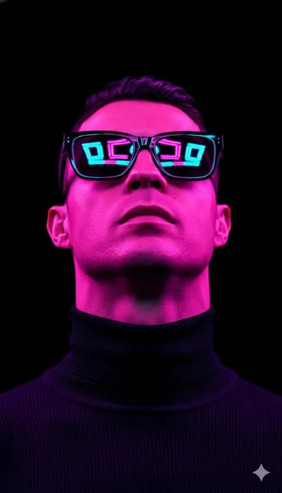 Futuristic portrait of a stylish person wearing oversized glossy black sunglasses with glowing neon pink and cyan geometric reflections, black turtleneck, head slightly tilted up, dark background, dramatic magenta and teal rim lighting, high contrast, cyberpunk aesthetic, ultra-realistic skin detail, studio shot, 85mm lens, sharp focus, 8K.