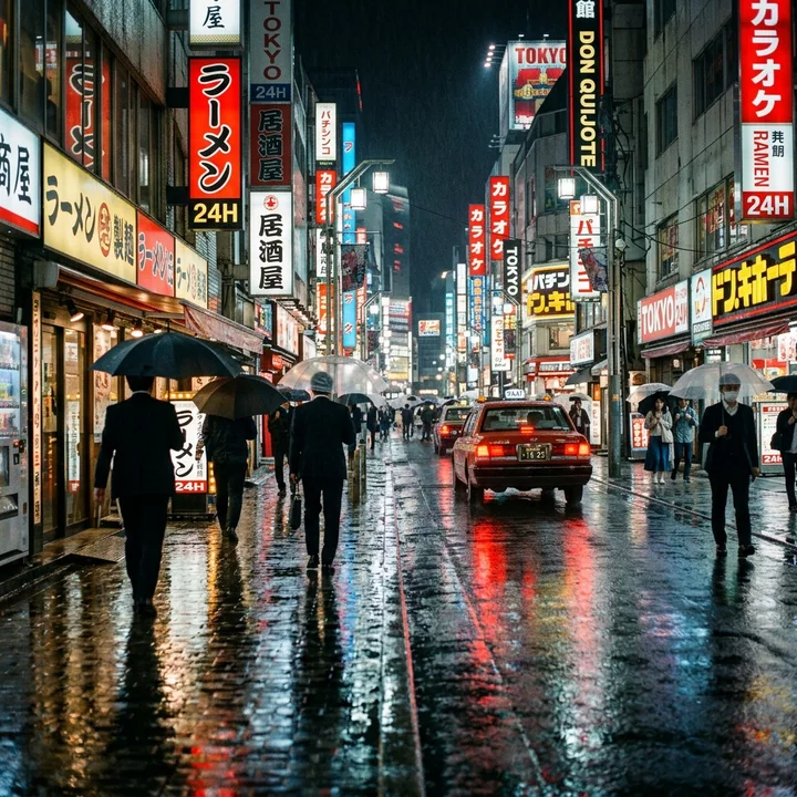 Tokyo street at night, neon signs reflecting on wet pavement, cinematic.