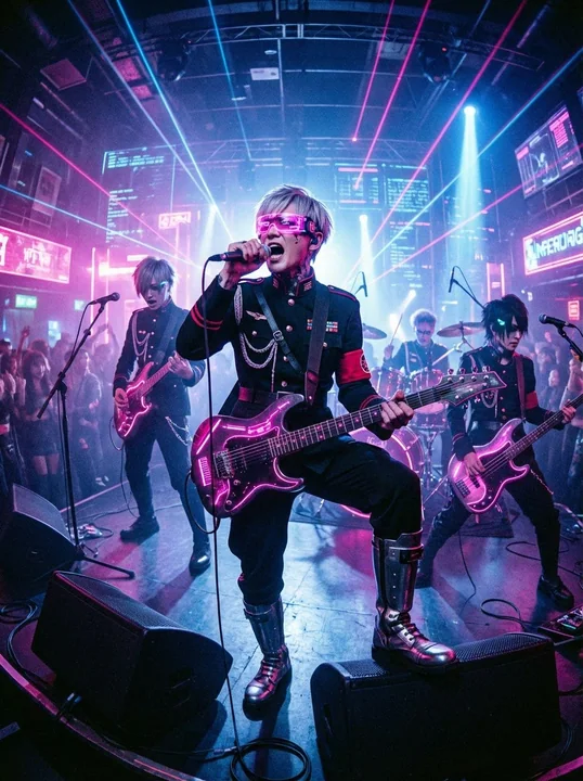 Quality: Photograph. Live-action film. *Please generate the photo using the reference image as a color palette. Please also use the reference image as a reference for tone, worldview, and composition when constructing the image. Camera/angle: Shot from a frontal angle, with a wide-angle lens from slightly below. Theme: A live performance scene of a Japanese band with a cyberpunk look. Guitarist/vocalist: A handsome man with short white hair, pink inner coloring, and a gold-blue gradient eye color. Vocalist's pose: Singing with his foot on the speaker. Clothing: A combination of 2000s V-kei fashion and cyberpunk. Looks like a visual kei band member. Cyberpunk military black officer's uniform with metal engineer boots. Red armband. Pink glowing infographic UI goggles. Band members: A band consisting of guitar, bass, and drums. Instrument design: A near-future, cyberpunk design with pink glows in places. Location: A live stage at an upscale nightclub in Shibuya in a cyberpunk setting 100 years in the future. Pause: The band is belting out.