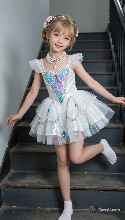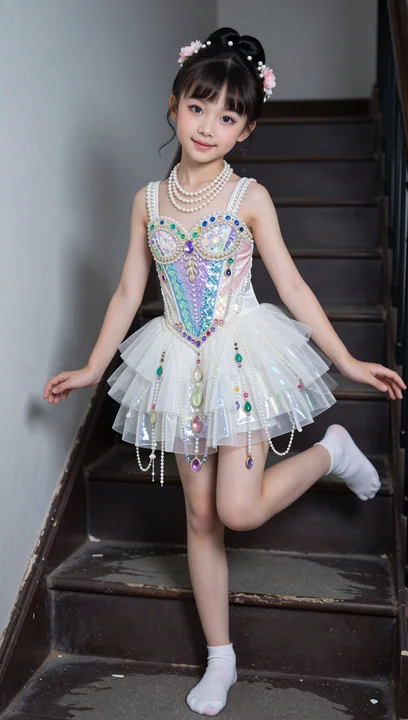 一个中国小女孩,大约8-10岁,腿很长,站在破旧的楼梯上。她有着金色盘起的头发,上面点缀着珍珠和粉色小花,脸上带着甜美乖巧的笑容,蓝色眼睛明亮。她身穿一件华丽的人鱼公主服,脖子上带了夜歌三圈的珍珠项链,花了眼影眼线,上身是紧身胸衣,缀满了闪亮的珠子和水晶,呈现出虹彩光泽;裙摆是多层白色薄纱和流苏,同样装饰着珠链和宝石。她双手放在两侧,身体略微前倾,面向镜头,单腿提起,脚上穿着白色袜子。背景是灰色墙壁和深色的楼梯。光线柔和,照亮了女孩的脸庞和服装的细节,营造出梦幻、优雅的氛围。构图以女孩为中心,视角略微仰视,突出了服装的精致和女孩的可爱。