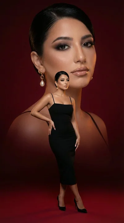 { "generation_request": { "meta_data": { "task_type": "editorial_beauty_fashion_poster_no_text", "language": "zh", "priority": "highest", "version": "v1.0_GLAM_RED_DUAL_COMPOSITION_NO_TEXT" }, "input": { "mode": "text_to_image", "notes": "创建一张受化妆品广告海报启发的高端美容和时尚编辑构图。无文字,无排版,无标志,无水印。" }, "output": { "aspect_ratio": "4:5", "resolution": "ultra_high", "num_images": 1, "sharpness": "high", "grain": "subtle_analog" }, "scene": { "background": "深暗红色渐变背景,底部渐变为近乎黑色,平滑的影棚背景", "composition": "双重曝光编辑布局:背景是一个大型柔焦魅力特写肖像,前景是一个全身站立姿势,居中构图,戏剧性的深度分层" }, "subject": { "person": "成年女性", "beauty_style": { "skin": "无瑕裸光肌肤,柔和修容,高光颧骨", "eyes": "烟熏眼影,分明睫毛,锐利飞扬眼线", "lips": "光泽裸色唇", "hair": "光滑深色后梳发型,优雅整洁" }, "wardrobe": { "dress": "修身黑色中长款吊带鸡尾酒裙,优雅简约", "shoes": "黑色高跟鞋", "accessories": "闪亮个性耳环" }, "pose": { "foreground_pose": "自信站立姿势,一手叉腰,身体略微倾斜,看向侧面", "background_pose": "大型美容特写肖像,柔和凝视镜头,略带模糊的动态效果" } }, "lighting": { "style": "影棚电影级美妆打光", "key_light": "柔和漫射正面光,突出颧骨和皮肤纹理", "rim_light": "微妙的暖色轮廓光,将主体与红色背景分离", "mood": "奢华、魅力、专业化妆品广告" }, "camera": { "lens": "特写使用 85mm 人像镜头,全身使用 50mm 镜头", "depth_of_field": "背景肖像景深较浅,前景人物景深适中", "quality": "高端编辑摄影" }, "restrictions": { "no_text": true, "no_logo": true, "no_watermark": true, "no_typography": true } } }