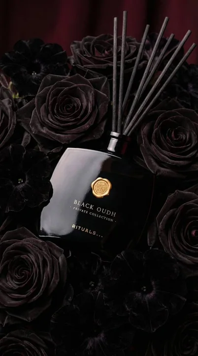 Сверхреалистичная фотография люксовой продукции: черная стеклянная бутылка диффузора с резинками, на которой нанесена этикетка «BLACK OUDH – Private Collection – RITUALS» в элегантном золотом серифном шрифте. Бутылка имеет изогнутую прямоугольную форму с мягкими краями, глянцевую отражающую поверхность и центральный золотой герб в стиле воска, расположенный ближе к верхней части. Тонкие черные резинки диффузора расходятся вверх от горлышка бутылки. На бутылке находятся реалистичные капли воды и конденсат, как будто она только что была обрызгана дождем. Бутылка размещена среди глубоких черных роз и темно-бургундных лепестков с видимыми каплями воды, окружена насыщенными зелеными листьями. Сцена мрачная и драматичная, с темным ботаническим фоном, мягко размытым (мелкая глубина резкости, эффект боке). Освещение кинематографическое и низкое, с мягкими диффузными бликами, отражающимися на влажной поверхности стекла. Холодные тона освещения (темно-зеленые и полуночно-синие) усиливают темную, роскошную атмосферу. Золотой герб и надпись тонко отражают свет, создавая премиум-аэстетику высокого класса. Композиция: вертикальная портретная ориентация (соотношение сторон 4:5), центральное размещение продукта, бутылка слегка наклонена, естественно вплетена в розы. Розы на переднем плане частично обрамляют нижнюю часть бутылки. Фон - темные растения, постепенно переходящие в тень. Акцент на текстуре: гипердетализированные капли воды, глянцевые отражения стекла, шелковистые лепестки роз, матовые черные резинки. Стиль: премиум-коммерческая реклама ароматов, макросъемка, объектив 85 мм, f/2.0, мелкая глубина резкости, фотореалистичная, разрешение 8K, резкое фокусирование на бутылке, драматичный контраст, насыщенные черные, эстетика роскошной рекламной кампании парфюмерии.