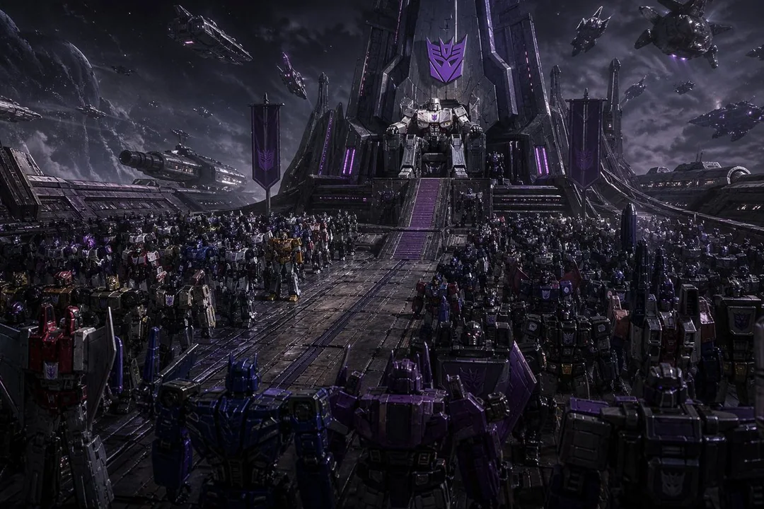 The entire Decepticon force lined up on the deck of an alien battleship, Megatron sitting on a throne looking down at the entire army 霸天虎全员列阵外星战舰甲板,威震天坐于王座俯视全军