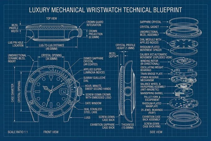 [ اسم المنتج ], رسم مخطط تقني, المنظور الأورثوغرافي, المنظور الأمامي + المنظور الجانبي + المنظور العلوي, فن الخطوط البيضاء المتجهية, خطوط البناء الرقيقة, مقاييس دقيقة, العلامات التوضيحية, أسهم الأبعاد, خلفية الشبكة, خلفية الأزرق الداكن, تصميم بسيط, أسلوب المخطط الهندسي, تفاصيل عالية