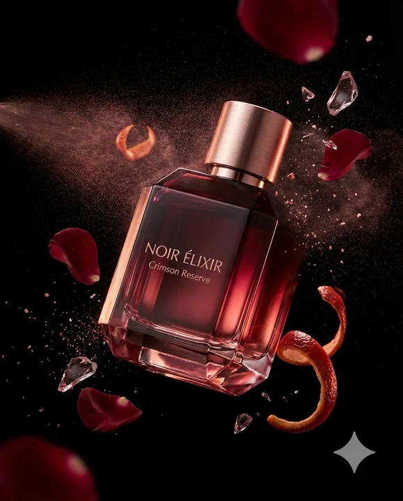 { "master_prompt": { "product": { "type": "luxury perfume bottle", "brand_name": "NOIR ÉLIXIR", "fragrance_line": "Crimson Reserve", "container_shape": "faceted geometric crystal bottle with sharp elegant edges", "material": "high-clarity glass with deep ruby gradient tint", "finish": "polished reflective surfaces with subtle matte facets", "cap_design": "magnetic cap in brushed rose-gold metal with engraved emblem", "label_style": "minimal serif typography etched directly into glass with metallic inlay", "liquid_color": "rich crimson red with glowing ruby undertones" }, "composition": { "scene_type": "ultra-cinematic luxury fragrance advertising photography", "orientation": "vertical", "aspect_ratio": "4:5", "camera_angle": "dramatic diagonal hero angle", "subject_position": "floating mid-air with slight forward tilt", "motion": "atomized perfume mist trails and fluid fragrance ribbons suspended in motion" }, "environment": { "background": "deep black velvet gradient fading into shadow", "atmosphere": "volumetric mist with delicate fragrance vapor swirling around the bottle", "floating_elements": [ "atomized perfume droplets suspended mid-air", "shattering crystal fragments catching highlights", "dark red rose petals drifting slowly", "glossy blood-orange peel curls", "fine rose-gold dust particles sparkling in light" ], "surface_effects": "micro condensation beads and polished reflections enhancing realism" }, "lighting": { "style": "dramatic low-key studio lighting", "key_light": "soft directional light sculpting the glass facets", "rim_lights": "strong rim lights outlining silhouette and edges", "accent_lights": "warm ruby and rose-gold specular highlights on cap and engraved details", "shadow_depth": "deep cinematic shadows for luxury mood", "contrast": "high contrast with controlled reflections and luminous highlights" }, "color_palette": { "primary_colors": ["obsidian black", "deep garnet", "ruby red"], "accent_colors": ["rose gold", "warm champagne glow"] }, "camera_settings": { "lens": "macro cinema prime lens", "depth_of_field": "shallow depth isolating product from background", "focus_point": "engraved logo and glass surface textures", "bokeh": "smooth cinematic bokeh from reflective particles", "detail_capture": "extreme micro-detail clarity" }, "render_quality": { "resolution": "8K ultra high definition", "render_style": "hyper-realistic luxury commercial render", "glass_physics": "accurate refraction and internal reflections", "liquid_simulation": "physically accurate fluid dynamics", "textures": "ultra-detailed crystal, metal, mist, and micro-droplet textures", "render_style_continuation": "hyper-realistic luxury commercial render" } }