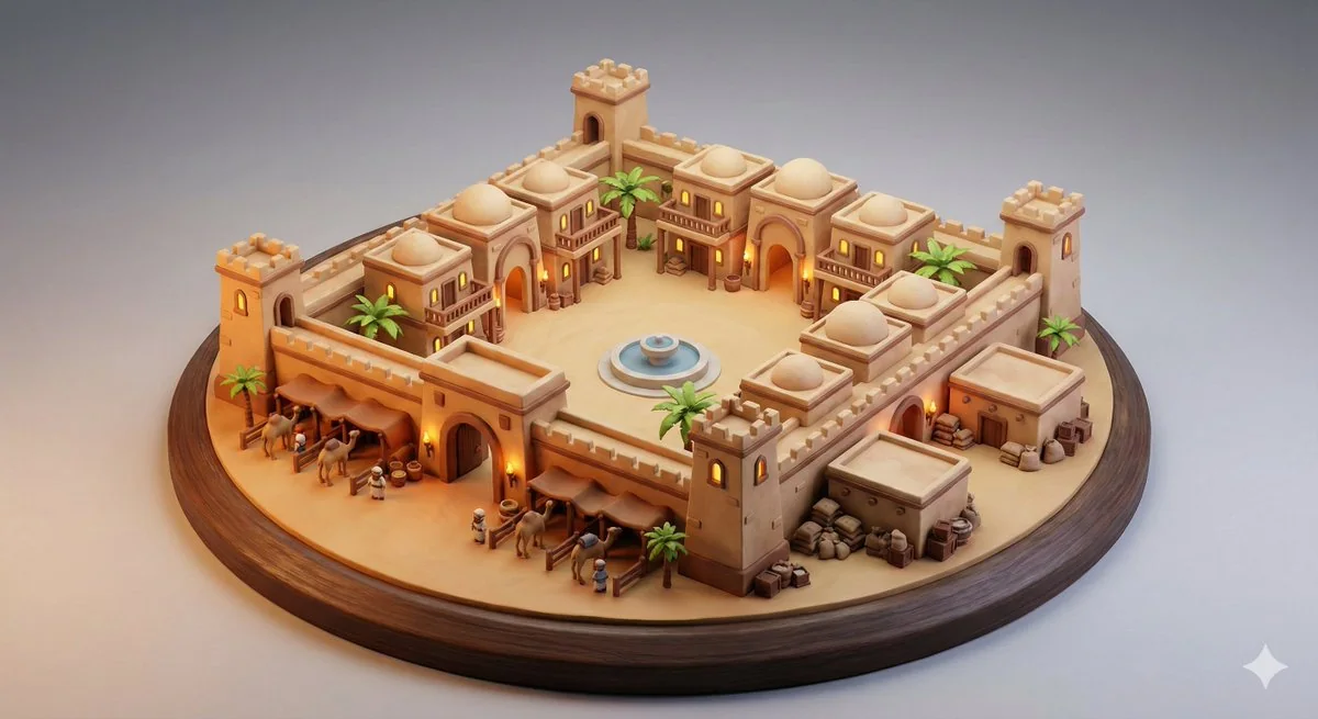 نموذج مصغر ثلاثي الأبعاد للإرشادات - الإصدار المتكامل المشهد: مقر متحرك في الصحراء مجهز بجدران خارجية سميكة، وساحة مركزية كبيرة، وعدد من أجنحة إقامة التجار، وحظائر للجمال، وبرج مراقبة، وبوابات مقوسة، وغرف تخزين متجمعة في السوق. إذا لم يُقدّم وصف للمشهد، فقم بإنشاء بيئة أو موقع معماري يمكن التعرف عليه ثقافيًا ومثيرًا بصريًا من اختيارك. اصنع تجميعة مدمجة من مستوطنة مصغرة أو منطقة أو بيئة تحتوي على عدة مباني ومسارات وعناصر من التصوير البيئي، مرتبة في تكوين عرض مدمج مناسب لنموذج مصغر قابل للجمع. عند إنشاء أو اختراع مشهد، أولويّة إعطاء تنوع معماري وثقافي، وتعديل البيئة نوعًا، ونمط المباني، وال 영감 التاريخي، والتأثير الجغرافي، والغرض من المستوطنة، بحيث يشعر كل نموذج مصغر بصريًا مميزًا وغير مكرر لمخططات القرية، المعبد، الحديقة، أو الساحة الشائعة. تأكد من أن العمارة تدور حول مركز طبيعي، بحيث تجمّع المباني بجاذبية مساحية معقولة، مما يشكّل مستوطنة مصغرة مدمجة، مع مباني مركزية أكثر كثافة وعناصر داعمة مرتبة خارجًا. اجعل التخطيط مدمجًا، متعدد الطبقات، ومتصلًا، ممتلئًا بشكل طبيعي على المنصة دون فراغات. تأكد من أن البيئة بأكملها تبدو بوضوح كنموذج مصغر يدوي صغير قابل للجمع، مع معمار مصغر ونسبة مصغرة للعالم النموذجي، وليس مباني حجمها الحقيقي. الأسلوب: اجعل الكاميرا في مسافة ثابتة لعرض المنتج، بحيث يبقى النموذج القابل للجمع كاملاً مرئياً مع هوامش مريحة، وتجنب التقاطات السينمائية القريبة أو اللقطات بزاوية منظور بيئي. اعرضه كنموذج ثلاثي الأبعاد مصغر أنيق مُجمّع على قاعدة عرض مركزة مُعرضة بالكامل ومركزية، مع عرض من زاوية طاولة مائلة قليلاً (3/4) أمام خلفية نظيفة متدرجة بأسلوب استوديو محايد. احافظ على مقاييس النماذج القابلة للجمع وعرضها النظيف. يجب أن يبدو كل عنصر مُنحوت من خزف ناعم لامع، أو مادة راتنج ملونة، أو بوليمر مُصمم بأسلوب معين، مع حواف منحنية، وشكل هندسي مبسط، ونسبة مبالغ فيها قليلاً تشبه الألعاب. احتفظ بال superficiality نظيفة ومُصممة بعناية. تجنب البصمات، والأنسجة اليدوية الخشنة، ومشاهد المختبر، وعمق المجال في التصوير المقرب، أو عيوب الخزف الفائقة الواقعية. استخدم إضاءة استوديو احترافية ناعمة: إضاءة عالمية لطيفة، ضوء رئيسية دافئ، إضاءة محيطية ناعمة، ظلال مُحكمة، وضوء داخلي دافئ للنافذة اختياريًا. عرض أي ماء أو مواد شفافة كراتنج شفاف تم صبّه، مع شفافية ناعمة، انعكاسات خفيفة، عمق داخلي لطيف، وحواف خفيفة مُصممة. اشمل تفاصيل بيئية صغيرة، ولكن اجعل كل شيء متماسكًا ومُبسطًا ونحتًا. أولويّة إعطاء نمذجة أنيقة نظيفة على تفاصيل نسيج فائقة الواقعية.