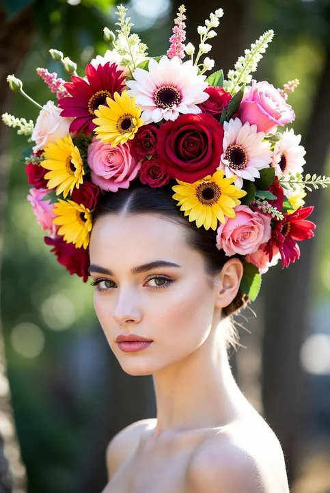 disposable photography of a beautiful fashion model wearing a huge flower hairband, 8k, photo realism, --ar 3:4