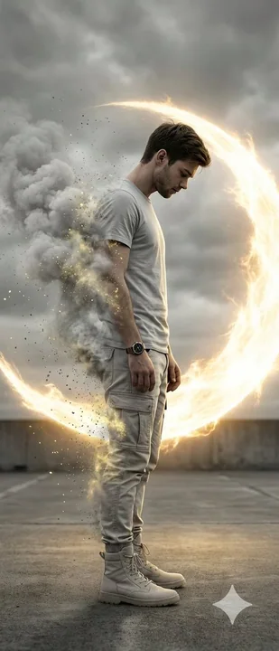 Transformez cette image [Uploader votre image] en une photo de portrait ultra-hyper-réalistique de 64K avec une résolution de 64K de type DSLR, une lumière dramatique à très fort contraste et un style de peinture numérique photo-réelle - utilisez exactement la référence faciale. L'homme (même visage que l'image téléchargée) est représenté en vue arrière complète, face à droite, son visage, ses cheveux courts et sombres ainsi que sa barbe bien entretenue recopient parfaitement sans aucune modification. Il porte un t-shirt à col roulé gris clair, un jean cargo tactique neutre clair, des bottes hautes de couleur claire et une montre à son poignet gauche. Sa posture est légèrement voûtée, la tête baissée, les yeux regardant vers le bas, les mains relâchées à ses côtés, transmettant une profonde introspection et une tristesse. Presque la moitié de son corps se dissout en une épaisse fumée grise en forme de nuage, remplie de particules de poussière dorée lumineuses. Son bras gauche, son épaule, son torse, ses jambes et une partie de ses cheveux deviennent transparents alors qu'ils se transforment en particules lumineuses, suggérant une désintégration active. Derrière et partiellement entourant l'homme se trouve une vaste aura énergétique en forme de croissant (C) lumineuse, émettant une lumière plasma dorée-blanchâtre incandescente. Cette aura agit comme un fort contour et une lumière arrière, mettant en valeur la fumée, la poussière et l'ombre. Le décor est minimaliste et austère : une surface en béton ou pavée désolée se joignant à un ciel très nuageux. La palette de couleurs est presque monochrome avec des gris et des blancs, contrastée par une intense lueur ambrée-or. Profondeur de champ peu profonde, éclairage lumineux/bloom, dispersion de particules, composition cinématographique, atmosphère émotionnelle et dramatique. Rendu Octane & Unreal Engine