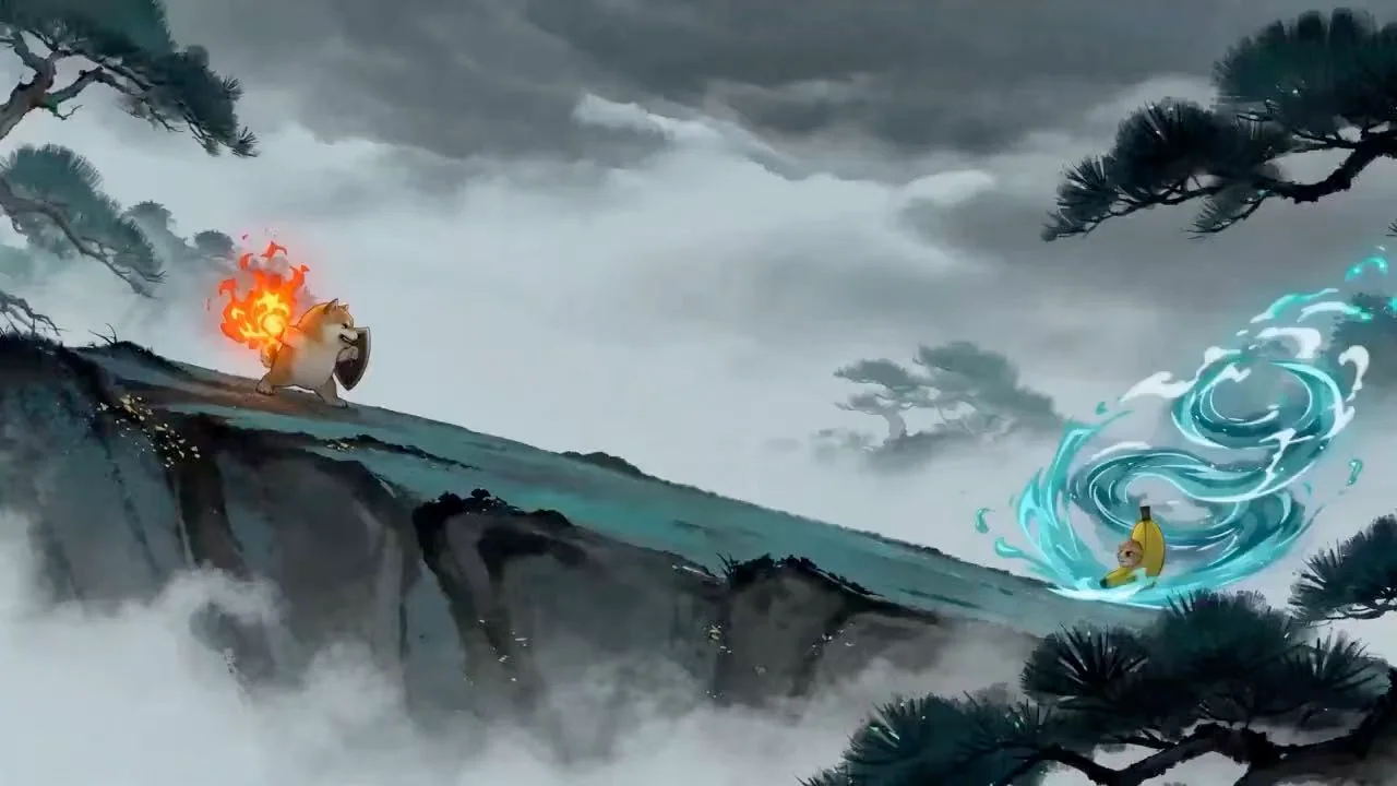 Authentic national comic style of Fog Hill of Five Elements, sharp hard-edged ink-wash lines, high-contrast main color palette of red-black and cyan-gold, cinematic lighting, oriental fantasy combat aesthetics, strong sense of impact, intense energy collision sensation, 16:9 aspect ratio, 15-second duration, smooth and fluid visuals, coherent and clear movements, full dynamic tension, premium overall texture, explosive special effects without visual clutter. Character Settings Character 1: Blade-Shield Dog, wielding a kitchen knife and a shield, with extremely strong melee oppressive presence. Main attributes: Fire, Metal, Earth. Combat style: fierce and domineering, high explosive power, full of impact. Shouts in battle: "My blade and shield!" Character 2: Banana Cat, agile and treacherous in movement. Main attributes: Water, Wood, Ice. Movements: light and swift, with eerie ink-wash charm and oriental spiritual aura. Shouts in battle: "Bibi Rabu!" Shot 1 (Opening Burst) At the summit of a cliff-side ancient forest, fierce winds howl and mist surges. Blade-Shield Dog and Banana Cat confront each other from afar then strike instantly. Crimson flame aura erupts from Blade-Shield Dog's palm, with surging fire waves charging forward; Banana Cat condenses a deep-blue ink-wash vortex around its body, from which a water dragon roars out. The fire waves and water dragon collide head-on in mid-air, instantly exploding into massive steaming mist and ink shockwaves, snapping trees and shattering rocks, with scattered gravel and sparks. Low-angle high-speed push-in, slight camera shake, interspersed with close-ups of energy collision, sharp rhythm. Blade-Shield Dog roars: "My blade and shield!" Shot 2 (High-Speed Melee Skirmish) The two engage in close combat instantly, with staggered high-speed motion blurs, launching an extremely fluid continuous close-to-mid range fight. Blade-Shield Dog slams with the shield and slashes with the knife, flames transforming into raging fire serpents, while Metal-element blade rain pours down for suppression, its offensive like a torrential flood; Banana Cat strikes with ink-wash whips, swiftly entangles with wood vines, dodges nimbly with agile movements, and launches sharp and rapid counterattacks. The two sides' elements counteract each other, with constant explosive collisions between Fire and Water, Metal and Wood. Rapid circular camera movement, combined with quick cuts and smooth focus tracking, clear movements without blurring. Amidst intense light and shadow flashes, Banana Cat shouts: "Bibi Rabu!" Shot 3 (Environmental Grapple) Combat escalates to environmental destruction. Blade-Shield Dog stomps violently on the ground, arousing earth veins, lifting massive rocks to bombard; Banana Cat condenses sharp ice spikes from water vapor, stabbing back at high speed from the side. Flames incinerate the ancient forest but are forcibly extinguished by ink-wash waterfalls; spinning Metal blades charge forward but are entangled and shattered by violently growing wood vines. The ground cracks continuously, broken trees fly everywhere, mountain cliffs collapse, and charred trees eerily regenerate under Water-Wood power. Slow-motion close-ups are added to highlight elemental clash details, then cut back to ultra-wide angle to show the full battlefield, accompanied by obvious vibration feedback. Blade-Shield Dog roars again: "My blade and shield!" Shot 4 (Ultimate Move Clash, Climax Finale) Both sides unleash their strongest domains simultaneously. Blade-Shield Dog unfolds a crimson black-gold flame battle domain, with rising flames, swirling metal blades, and levitating earth and rocks, forming a destructive oppressive field; Banana Cat activates a deep-blue cyan-gold ink-wash spiritual domain, with coiling water dragons, sky-covering wood vines, rain-like ice spikes, and rolling ink waves. The two domains collide head-on at the center of the cliff-side ancient forest, darkening heaven and earth; after intense energy compression, they burst loudly, forming a giant triple shockwave of fire, water and ink, overturning the entire forest in an instant. Finally, Blade-Shield Dog charges forward against the shockwave, breaking waves with the shield, its kitchen knife ignited with extreme flames, slashing through the core energy in one strike; Banana Cat also charges head-on enveloped in ink-wash dragon shadows, the two freezing in collision with their strongest strikes. The scene ends with a super explosion, with mist, sparks, ink streams and gravel bursting out simultaneously, concluding with a stunning visual. Final Footage Requirements The overall rhythm refers to the high-burning national comic combat performance of Fog Hill of Five Elements, sharp camera movement, clear and fluid movements, strong sense of impact, explosive energy collision, obvious environmental destruction, distinct character personalities, four shots progressing layer by layer, culminating in a climax burst, ensuring a top-tier oriental elemental battle with extreme 观赏性 completed within 15 seconds. 雾山五行正统国漫画风,锐利硬边水墨线条,高对比红黑与青金主色调,电影级光影,国风奇幻战斗美学,强打击感,强能量碰撞感,16:9,时长15秒,画面流畅丝滑,动作连贯清晰,动态张力拉满,整体质感高级,特效炸裂但画面不乱。 角色设定: 角色一:刀盾狗,手持菜刀与盾牌,近战压迫感极强,火、金、土属性为主,战斗风格刚猛霸道,爆发力强,冲击感十足。战斗中高喊:“我的刀盾!” 角色二:香蕉猫,身法灵动诡谲,水、木、冰属性为主,动作轻巧迅疾,带水墨妖异感与东方灵气。战斗中高喊:“比比拉布!” 镜头1(开场爆发): 断崖古林之巅,狂风卷动,雾气翻涌,刀盾狗与香蕉猫隔空对峙后瞬间出手。刀盾狗掌心爆发赤红烈焰罡气,火浪席卷前冲;香蕉猫周身凝聚幽蓝水墨漩涡,水龙咆哮冲出。火浪与水龙在空中正面