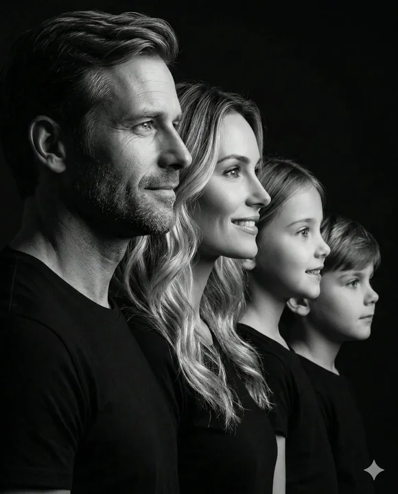 Photorealistic black and white studio portrait of a family of four in profile, facing right. Features a staggered diagonal composition: a slightly bearded adult man in front, followed by a smiling adult woman with wavy hair, a young girl, and a young boy in the back. All subjects wear plain black crew-neck shirts against a solid black background. Dramatic, high-contrast side lighting highlights facial contours and hair textures while blending their backs into deep shadows. Cinematic, timeless mood, 8k resolution, highly detailed, 4k, vertical portrait, sharp focus.