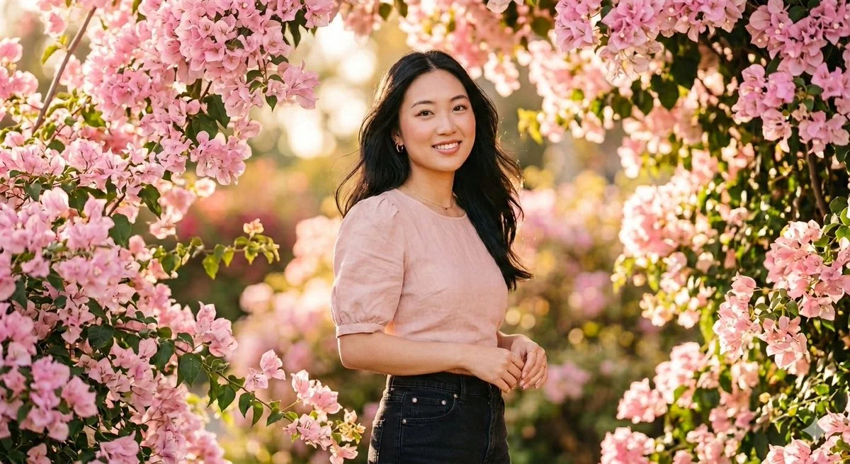 An ethereal 8K portrait capturing a young Asian woman surrounded by cascading pink bougainvillea blossoms. She wears a blush-toned tailored top styled with high-waisted black denim, creating a soft yet modern contrast. Her complexion glows naturally with a hint of rosy makeup, complemented by a calm, effortless smile. Silky black hair moves gently with the breeze, adding life to the frame. Bathed in warm pastel hues and golden daylight, the image features a dreamy shallow focus, velvety background blur, and refined cinematic lighting. The overall mood feels elegant, feminine, and visually enchanting with ultra-high-definition clarity. 一幅空灵的 8K 肖像,描绘了一位年轻的亚洲女性,周围环绕着层叠的粉色九重葛花。她身穿一件腮红色的定制上衣,搭配高腰黑色牛仔裤,营造出柔和而现代的对比。她的肤色自然焕发光泽,略带玫瑰色妆容,配以平静、从容的微笑。柔顺的黑发随风轻拂,为画面增添了生机。图像沐浴在温暖的柔和色调和金色日光中,呈现出梦幻般的浅景深、柔和的背景虚化和精致的电影级光线。整体氛围优雅、柔美,视觉上充满魅力,并具有超高清的清晰度。