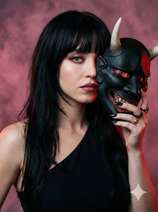 Use the face in the photo. Create an image. Ultra-detailed. Ultra-realistic. Scene & Atmosphere: A dramatic, close-up portrait set against a smoky, dusk-pink background swirling with soft, fog-like textures. Ambient light casts moody shadows across the scene, blending warm red undertones with cool charcoal gradients. There is a subtle backlight that catches the edges of her hair, giving a cinematic halo effect. Pose & Expression: The woman turns slightly over her shoulder, her face half-hidden behind a dark, intricately carved oni mask she holds close. One eye remains fully visible — sharpened, intense, and subtly glowing with warm, reflective catchlight. Her expression is calm but dangerously alluring, as if she’s revealing only a part of her true identity. -- Hair (Important): Long, jet-black layered hair flowing past the chest with soft internal layering for natural movement and dimension. Full blunt bangs grazing just above the eyebrows, slightly feathered at the edges to avoid heaviness. The fringe is dense at the center and subtly tapered toward the temples for a refined, face-framing effect. Hair texture is ultra-sleek with a healthy, glass-like shine, yet retains soft movement at the ends. Layers are seamless and blended — no choppy or uneven cuts. Subtle natural lift at the crown adds quiet volume while maintaining a smooth silhouette. Backlight catches the outer edges of the hair, creating a luminous halo outline against the smoky background. --- Makeup (Important): Flawless porcelain matte skin with soft inner glow on high points. Skin texture smooth and refined, natural depth preserved. Eyes: Gradient shadow technique — deep rose blending into muted plum and warm taupe. Soft diffused blending, no harsh lines. Lifted eyeliner wing with tightlined upper lash line. Subtle aegyo-sal contour under the eyes for dimension. Individual lash clusters for natural but defined volume. Brows: Straight-to-soft-arched Korean brow shape, refined and elongated tail. Lips: Muted deep rose gradient lip with softly diffused edges and subtle satin sheen. Hazel eyes with reflective catchlight. --- Oni Mask (Ultra-realistic): A traditional Japanese oni mask made of matte obsidian-black lacquer. Sharp, curved horns in bone-white ivory. Intricate carvings along the cheekbones and forehead. Thin cracks and subtle texture to show realism and craftsmanship. Glowing ember-red eye slits and jaw lines that reflect off the woman’s skin, creating a fiery contrast. Mask is positioned just enough to reveal her own eye — making the two faces coexist. --- Outfit: A sculpted asymmetrical black top crafted from matte stretch silk-crepe with subtle sheen under rim light. One shoulder fully exposed, revealing defined collarbone and elegant neckline. The opposite side features a structured, sculpted shoulder with clean architectural lines.