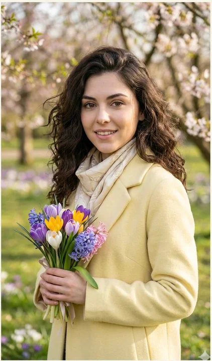 STRICTLY preserve the appearance of the woman from the photo 1:1 — face, features, proportions, age, skin texture, and individual characteristics. Do not change or stylize the face. Create a realistic spring greeting card in the format of a photograph. A woman is standing outdoors among the first spring flowers. Her face is in a slight three-quarter profile, with a soft, lively smile. Her hair falls freely and naturally. She is wearing a light spring coat or jacket in a soft yellow palette and a light scarf. In her hands is a fresh bouquet of crocuses and hyacinths. Background: blurred trees with the first buds, soft green grass, and sunny spring light. A light breeze creates a sense of movement. Lighting is natural — soft daytime sun, warm highlights on her hair and skin. Colors are fresh and lively. The composition is designed as a printed greeting card: — a neat light frame — light bokeh — soft depth of field In the upper part of the greeting card, written in a beautiful, readable font: "Happy First Day of Spring!" Photorealism, high detail, the atmosphere of a genuine spring moment.