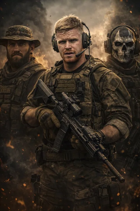 A hyper-realistic, cinematic 9:16 portrait of a modern military squad lineup. In the middle stands, wearing tactical combat gear with a vest, headset, gloves, and a futuristic assault rifle. On the left: a rugged soldier with a beard and boonie hat, wearing heavy tactical armor. On the right: a mysterious masked operative with a skull-patterned mask and combat uniform. The three stand side by side as an elite special forces unit, set in a gritty warzone environment with sparks, smoke, and cinematic lighting. Ultra-detailed, realistic textures, game-poster style, 8K 一张超写实、电影风格的 9:16 肖像画,描绘了一支现代军事小队。画面中央站立着一名身着战术作战装备(包括背心、耳机、手套)并手持未来派突击步枪的士兵。左侧是一名留着胡须、戴着奔尼帽、身穿重型战术盔甲的粗犷士兵。右侧是一名戴着骷髅图案面罩、身穿作战服的神秘蒙面特工。三人并肩而立,组成一支精英特种部队,置身于一个充满火花、烟雾和电影化灯光的残酷战区环境。画面细节超精细,纹理逼真,呈游戏海报风格,8K 分辨率。