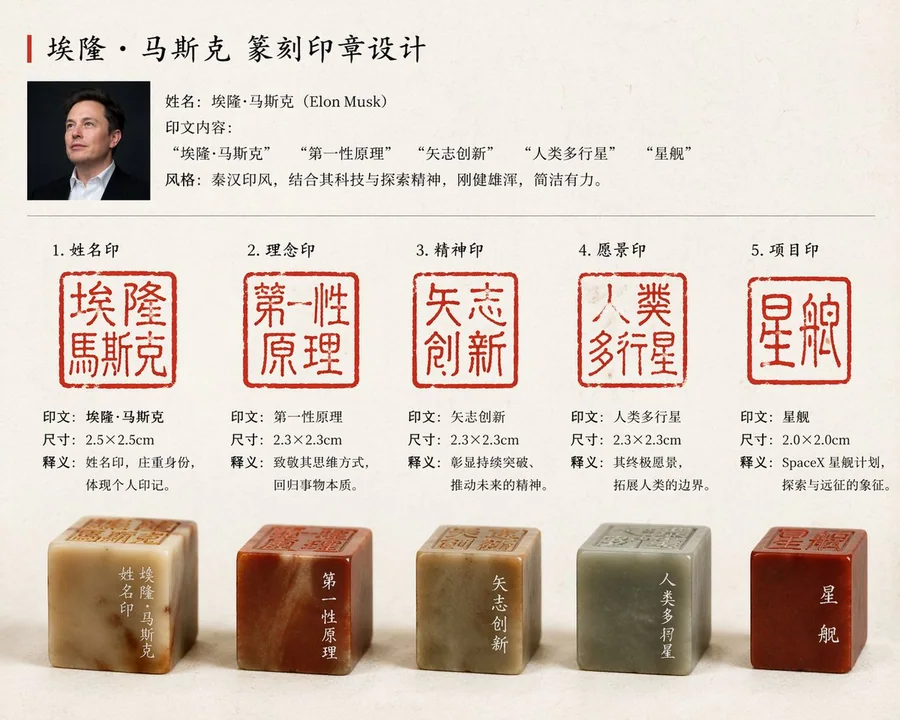 Design a set of seal carving stamps for "Elon Musk"