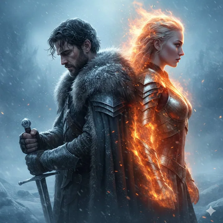 A dramatic cinematic poster-style portrait of two epic fantasy warriors standing back-to-back in a frozen storm. On the left, a battle-worn male warrior with wet, curly dark hair, head bowed in quiet resolve, gripping a medieval sword planted into the ice. Frost and snow cling to his fur-lined cloak and shoulders. On the right, a powerful female warrior in profile, pale skin glowing with fiery orange light, her body partially engulfed in flames that contrast against the icy blue atmosphere. Snow particles swirl through the air, blending fire and ice in a symbolic clash. Ultra-detailed faces, emotional intensity, volumetric fog, cinematic lighting, cold blue tones mixed with warm fire highlights, shallow depth of field, epic fantasy movie poster, hyper-realistic, 8K resolution, dramatic composition, sharp focus, high contrast, photorealistic textures.