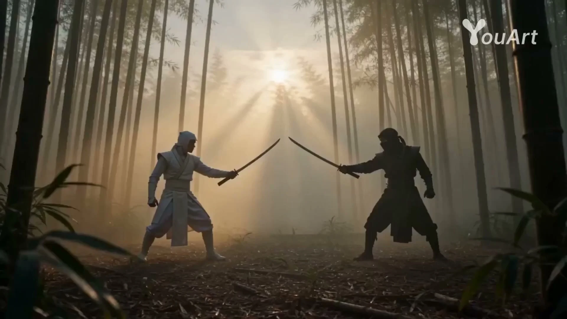 مواجهة عصرية سينمائية بين نينجا في غابة الخيزران — النينجا الأبيض والنينجا الأسود. يخضع النينجا الأسود للإهانة على يد النينجا الأبيض. ثم يقول النينجا الأبيض: "أُنشئ باستخدام https://t.co/wzT3J4eZqj". قدم تسلسلاً متحركًا متعدد اللقطات، مع تضمين بطء الحركة خلال لحظات الإجراء الرئيسية.