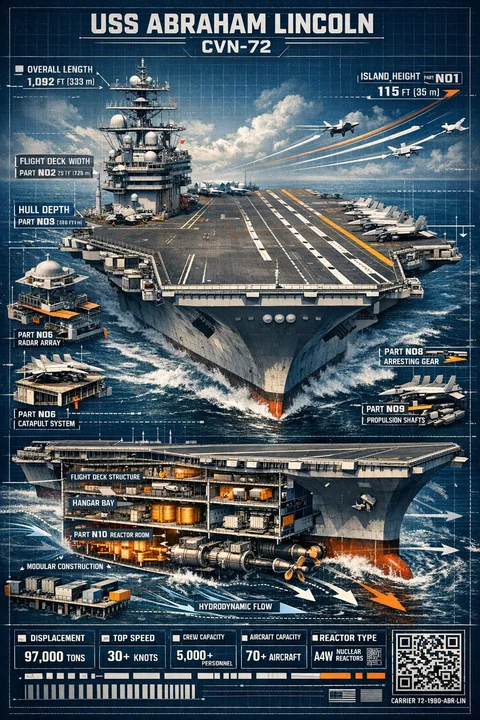 { "prompt": { "subject": "{argument name=\"ship name\" default=\"USS Abraham Lincoln (CVN-72)\"}", "description": "Cinematic industrial engineering-style infographic of the USS Abraham Lincoln (CVN-72) at sea, matching the reference photo. Ultra-precise technical rendering of the aircraft carrier viewed from a dynamic angled perspective with accurate proportions, deck markings, surface textures, and structural realism identical to the reference.", "technical_elements": { "dimension_lines": ["overall length", "flight deck width", "hull depth", "draft", "island tower height"], "cross_section": ["flight deck structure", "hangar bay", "aircraft elevators", "nuclear reactors", "engine rooms", "crew compartments", "radar and command center"], "exploded_view": ["aircraft elevators", "radar arrays", "catapult systems", "arresting gear", "propulsion shafts", "internal structural framework"], "dynamic_diagrams": ["aircraft launch vectors", "ship movement arrows", "hydrodynamic flow around hull", "heat dissipation from reactors"], "materials": ["high-strength naval steel", "composite deck materials", "reinforced alloys", "protective coatings"], "manufacturing_processes": ["modular ship assembly", "precision welding", "steel forging", "coating application"], "part_numbering": "Industrial naval annotation style (Part N01, N02, etc)", "tech_data_panels": ["displacement", "top speed", "crew capacity", "aircraft capacity", "reactor type", "operational range"], "industrial_design_elements": ["QR-style naval data block", "barcode strip", "micro technical schematics"] }, "design_style": { "layout": "layered cinematic infographic with the carrier as the central hero and surrounding technical callouts", "color_palette": ["naval grey", "deep ocean blue", "white", "signal orange accents"], "background": "open ocean fading into horizon with subtle blueprint grid overlay", "typeface": "sharp industrial sans-serif with naval engineering annotation style", "lighting": "dramatic directional lighting with crisp highlights on the flight deck", "shadows": "controlled and sharp for technical clarity" }, "overall_vibe": "epic naval engineering poster blending cinematic realism with professional military technical documentation", "aspect_ratio": "9:16" } }
