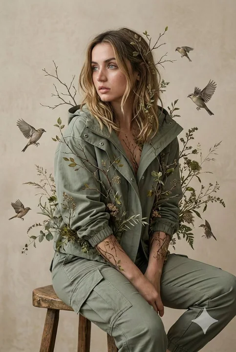 { "meta": { "title": "Nature-Human Fusion Editorial Portrait", "quality": "ultra-realistic", "resolution": "8K", "aspect_ratio": "4:5", "style": "editorial fashion photography, cinematic, dreamy atmospheric mood", "camera": "Full-frame DSLR", "lens": "85mm prime lens", "depth_of_field": "shallow", "focus": "sharp focus on face, soft bokeh background" }, "concept": { "theme": "Nature-human fusion", "description": "A thoughtful young woman merging organically with natural elements, symbolizing harmony between humanity and the environment", "mood": "calm, introspective, ethereal, cinematic", "color_palette": "muted earthy tones, sage green, warm beige, soft browns, subtle moss tones" }, "subject": { "type": "female model", "age_range": "early 20s", "expression": "thoughtful, slightly distant gaze, serene and introspective", "pose": "sitting naturally on a rustic wooden stool, relaxed posture, hands resting gently", "face_details": { "skin_texture": "high detail texture, realistic pores, natural tone", "makeup": "minimal natural makeup, soft matte finish, subtle contour", "focus_area": "eyes in sharp detail" } }, "wardrobe": { "upper_body": { "item": "hooded jacket", "color": "sage green", "material": "matte cotton-blend fabric", "style": "casual modern cargo-inspired" }, "lower_body": { "item": "cargo pants", "color": "earthy olive/sage tone", "fit": "relaxed tailored fit", "texture_detail": "visible stitching and soft fabric folds" } }, "environment": { "background": { "type": "minimal studio backdrop", "color": "soft beige", "texture": "smooth, subtle gradient" }, "props": { "primary": "rustic wooden stool with visible grain texture", "natural_elements": [ "delicate tree branches emerging and blending into her arms and shoulders", "soft wild foliage seamlessly merging with her clothing and silhouette", "subtle leaves growing organically from fabric edges" ], "birds": { "presence": "small birds flying mid-air around subject", "motion_style": "frozen mid-flight with slight motion blur on wings", "symbolism": "freedom and harmony" } } }, "lighting": { "type": "soft diffused studio lighting", "direction": "gentle front-side key light with soft fill", "quality": "natural, wraparound light with smooth shadows", "highlight_style": "subtle glow on skin and foliage edges", "shadow_detail": "soft cinematic contrast" }, "composition": { "framing": "medium portrait, subject centered with natural elements framing her", "camera_angle": "eye-level", "rule_of_thirds": "face positioned slightly off-center for dynamic balance", "depth_layers": "foreground soft foliage" } }