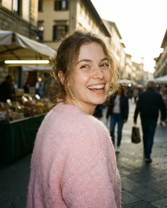 Paparazzi-style extreme close-up photo of a young woman with a cute, glowing aesthetic, caught mid-laugh while looking back over her shoulder. Shot from a low angle. Bright, crisp on-camera flash, light film grain, raw candid "street style" photography feel. Background is a sun-drenched, bustling European marketplace with soft motion blur and golden hour bokeh. No text, dates, or watermarks on the image. She is wearing a soft pastel pink fitted mohair sweater. Ultra-realistic, cinematic realism, high detail skin texture with soft freckles, slight wide-angle lens distortion. Camera style: “35mm point-and-shoot, f/2.8, bright daylight flash” Look: “Clean aesthetic street snap, high-end lifestyle blog feel” Quality: “Sharp focus on the eyes, warm radiant atmosphere, zero graphic overlays” 狗仔队风格的特写照片,一位年轻女士,笑容可爱,散发着光芒,在回头时被抓拍到大笑的瞬间。低角度拍摄。明亮、清晰的机载闪光灯,轻微的胶片颗粒感,原始、抓拍的“街头风格”摄影感觉。背景是阳光普照、熙熙攘攘的欧洲市场,带有柔和的运动模糊和黄金时段的焦外虚化。图片上没有文字、日期或水印。她穿着一件柔软的淡粉色修身马海毛毛衣。超现实主义,电影般的真实感,高细节皮肤纹理,带有细微雀斑,轻微的广角镜头畸变。 相机风格:“35mm 傻瓜相机,f/2.8,明亮的日光闪光灯” 外观:“干净美观的街拍,高端生活方式博客的感觉” 质量:“眼睛对焦锐利,温暖明亮的气氛,零图形叠加”