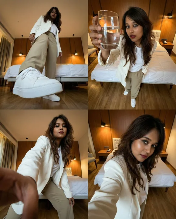 将原始照片转换为4种不同风格的戏剧性、超逼真、超详细的图像,每种风格均为中景特写广角镜头,采用极端、动态的拍摄角度(包括更多从正上方或正下方拍摄的网格视图),其中有一个或多个身体部位紧邻镜头并显得巨大,其余身体部分在透视中强烈后退,同一个人在原始环境的扩展版本中摆出时尚、复杂、有力的姿势,具有电影般的灯光、高对比度、清晰的纹理和精确的色彩分级。