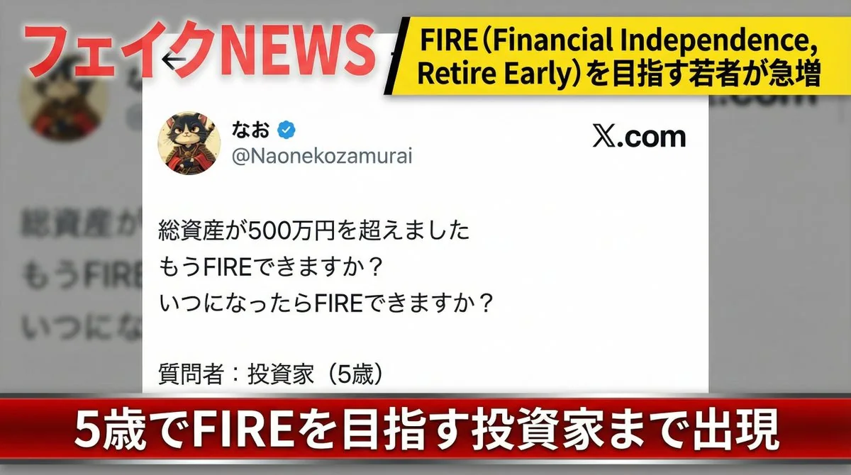 偽ニュース画像を作成し、参照画像を紹介します。画面の左上隅に「FAKE NEWS」という水印のテキストを追加してください。画面の右上隅に「若い人々がFIRE(財務的独立、早期退職)を目指す人数が急激に増加している」という見出しを追加してください。画面の下部に「5歳でFIREを目指す投資家も登場している」というスクロールテキストを追加してください。