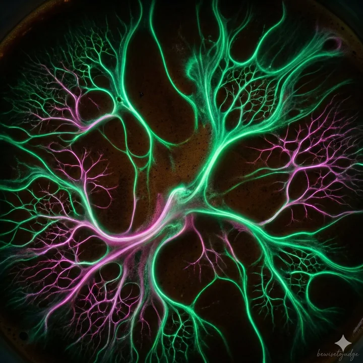 Vue microscopique abstraite de la crème de café vivante, des tentacules lumineux délicats et des réseaux fractals s'étendant naturellement sur la base sombre de l'expresso, effets bioluminescents subtils en tons émeraude et magenta, formes organiques fluides avec des détails complexes, fantaisie biologique surréaliste, style de photographie macro ultra net, éclairage volumétrique dramatique, aucun élément d'horreur, atmosphère artistique et merveilleuse, qualité 8k