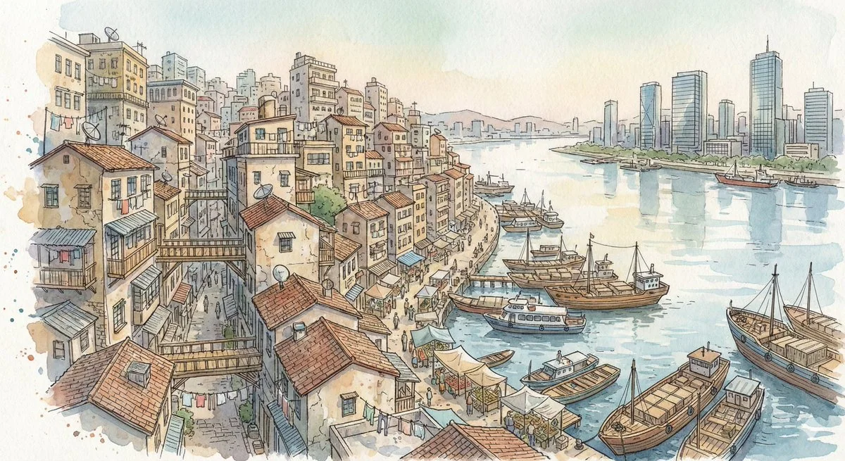 Scene: A dense hillside city spreads downward toward a wide river harbor packed with cargo ships, ferries, and floating markets. Countless tightly stacked buildings climb the slopes, their rooftops crowded with satellite dishes, water tanks, and hanging laundry. Elevated pedestrian walkways cross between structures while narrow alleys descend toward the waterfront. In the far distance, modern glass towers rise from the opposite shore, contrasting sharply with the older layered district and emphasizing the city’s vast urban sprawl. Style: Fantasy hand-drawn watercolor illustration style. Traditional watercolor rendering with visible pigment splashes, fluid paint diffusion, and softly blended tonal transitions. Delicate hand-illustrated linework with expressive drawn detailing and organic sketch-like contours. Soft, gentle color palette emphasizing airy tones and subtle saturation rather than strong contrast. Painterly layered watercolor textures combined with illustrative fantasy art aesthetics. Decorative, richly illustrated environments with numerous small background details integrated into the composition. Elegant full illustration treatment prioritizing handcrafted visual charm, artistic softness, and classic storybook-inspired fantasy rendering. 场景: 一座密集的山坡城市向下延伸,直至宽阔的河流港口,港口内停满了货船、渡轮和水上市场。无数紧密堆叠的建筑爬满山坡,屋顶上挤满了卫星天线、水箱和晾晒的衣物。高架人行道在建筑之间穿梭,狭窄的小巷则通向水边。远处,现代玻璃塔楼从对岸拔地而起,与古老的分层街区形成鲜明对比,凸显了这座城市广阔的城市蔓延。 风格: 奇幻手绘水彩插画风格。传统水彩渲染,带有可见的颜料飞溅、流畅的颜料扩散和柔和混合的色调过渡。精致的手绘线条,带有富有表现力的细节描绘和有机素描般的轮廓。柔和、温和的调色板,强调轻盈的色调和微妙的饱和度,而非强烈的对比。画意盎然的分层水彩纹理与插画奇幻艺术美学相结合。装饰性强、细节丰富的环境,构图中融入了许多小背景细节。优雅的完整插画处理,优先考虑手工制作的视觉魅力、艺术柔和感和经典故事书风格的奇幻渲染。