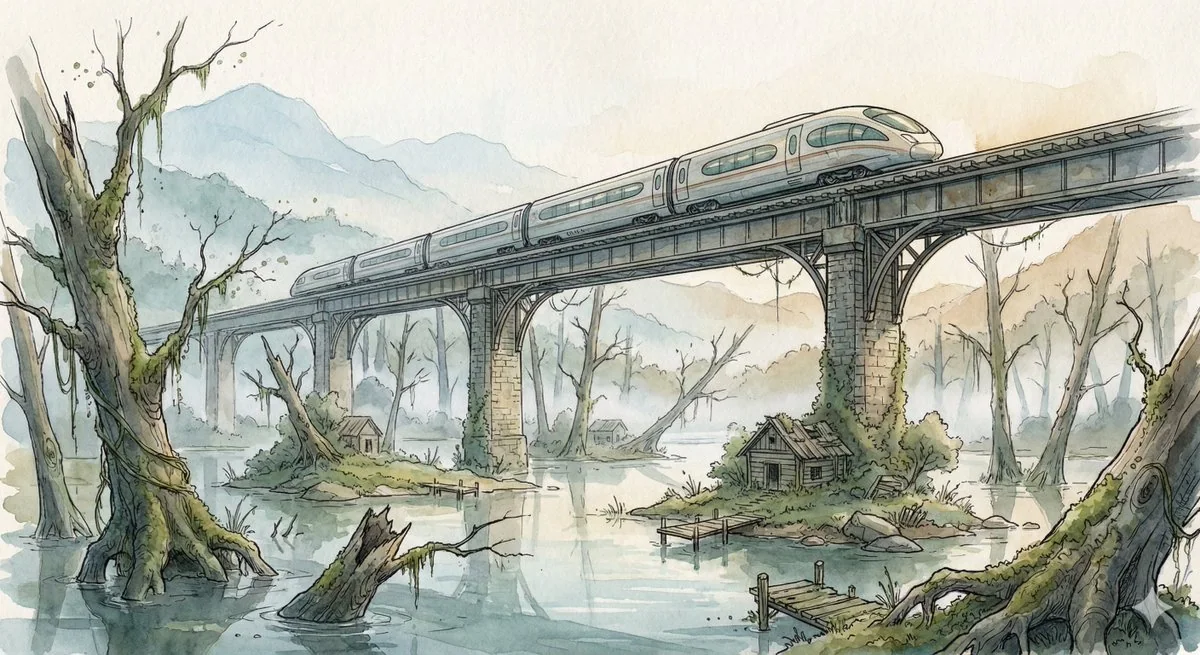 シーン: スリムな高速列車が、巨大な洪水でできた森の谷を横断する高架橋の上を滑るように走っている。静かな水面から半分沈んだ古びた木の幹が浮かび上がり、苔が生えた小さな地面には、放棄された木造の小屋や破損した桟橋が散見される。森の骨格のような木々の間を朝靄が漂い、遠くの山々は白く薄い大気の向こうへと消えていく。橋は遠くへと伸びていき、繰り返される支え構造が静かで神秘的な風景に強い映画的透视线を生み出している。 スタイル: ファンタジーな手描き水彩画スタイル。伝統的な水彩技法を用い、顔料の飛び散りや流れるように広がる絵の具の拡散、そして柔らかく融合したトーンの移行が見られる。繊細な手描きの線画と、表現力に満ちた描線と、自然なスケッチ風の輪郭が融合している。柔らかく穏やかなカラーパレットが使用され、強烈なコントラストよりも、空気感のあるトーンと繊細な彩度が強調されている。画的な層を重ねた水彩の質感と、イラストレーションのファンタジー芸術の美学が融合した表現。装飾的で、詳細に満ちた環境が構図に多く取り入れられており、手作りの視覚的魅力、芸術的な柔らかさ、そして古典的な絵本風のファンタジー表現が優先されている。