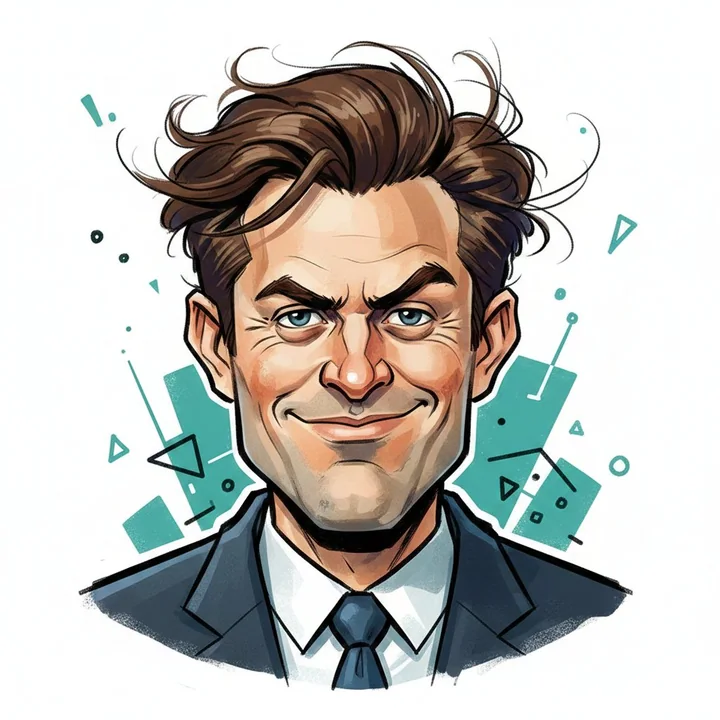 { "meta": { "quality": "ultra detailed illustration, 4k", "camera": "portrait framing", "lighting": "soft studio lighting with subtle shadows", "style": "editorial caricature illustration, digital painting, bold lines" }, "scene": { "location": "minimal background with teal geometric shapes and paint splashes", "atmosphere": "modern, artistic, magazine cover aesthetic" }, "subject": { "gender": "male", "body": { "type": "stylized caricature proportions", "pose": "front facing portrait, confident posture" }, "face": { "features": "exaggerated jawline, expressive eyebrows, slightly messy hair, subtle beard texture", "expression": "smirk with raised eyebrow, confident attitude" }, "outfit": { "description": "modern casual jacket with simple shirt", "fit": "clean and stylized" } }, "effects": { "special": "textured brush strokes, bold outlines, soft paint splatter accents, clean editorial composition" } }