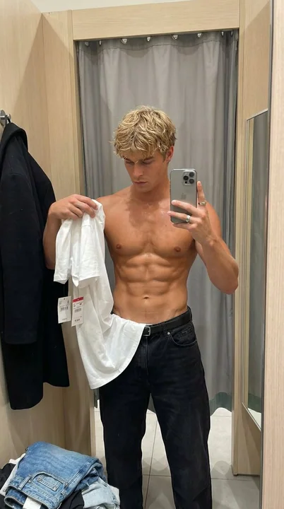 "prompt": "mirror selfie in clothing store fitting room, athletic young man early 20s shirtless showing ripped abs and muscular torso, defined six-pack, tanned skin, short brown hair, serious/downward looking expression, holding up a white cropped t-shirt with curved hem in both hands examining it, wearing black slim jeans with belt, orange wristband, silver ring, black coat partially visible, phone in hand taking selfie visible in mirror reflection, fitting room gray curtain, beige wooden walls, price tags, pile of jeans and clothes on floor, casual candid gym-bro vibe, natural indoor store lighting, photorealistic, detailed skin texture pores sweat, sharp focus, 8k, shot on iPhone 15 Pro, realistic shadows", "style": "photorealistic", "aspect_ratio": "9:16", "quality": "8k", "lighting": "natural indoor store lighting", "camera": "shot on iPhone 15 Pro", "negative_prompt": "blurry, low resolution, cartoon, anime, deformed, extra limbs, bad anatomy, watermark, text, signature, overexposed, underexposed, ugly, poorly drawn face, bad proportions", "model": "realistic", "seed": null, "steps": 50, "cfg_scale": 7.5